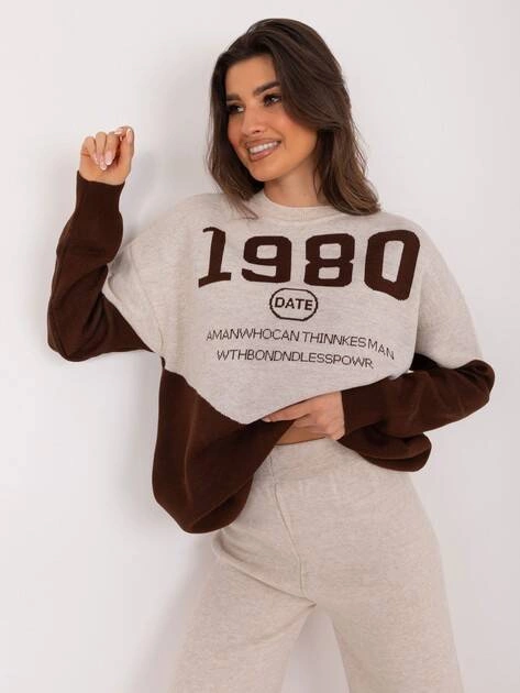 Beżowo-brązowy dzianinowy komplet z szerokimi spodniami