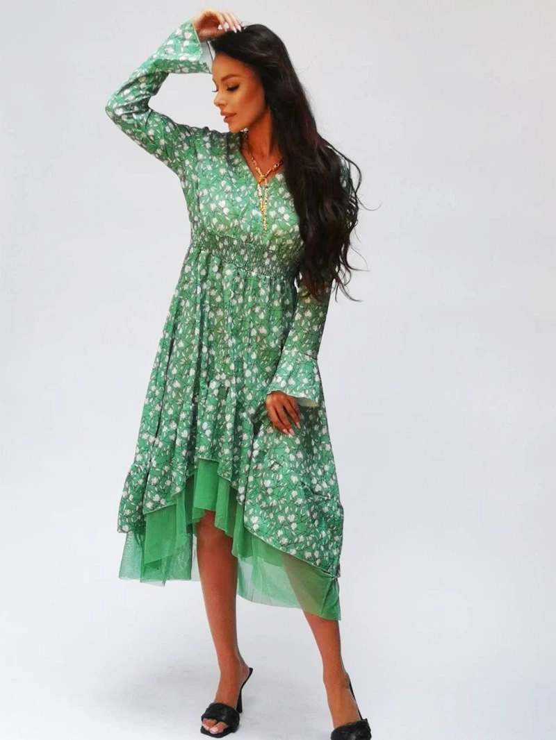 Romantyczna sukienka w kwiaty z nieregularnym wykończeniem zielona
