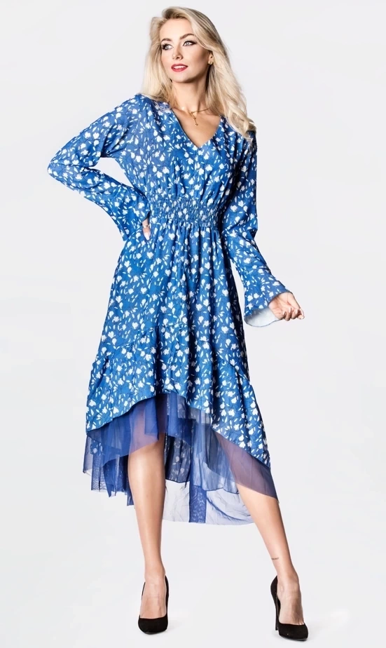 Romantyczna sukienka w kwiaty z nieregularnym wykończeniem niebieska