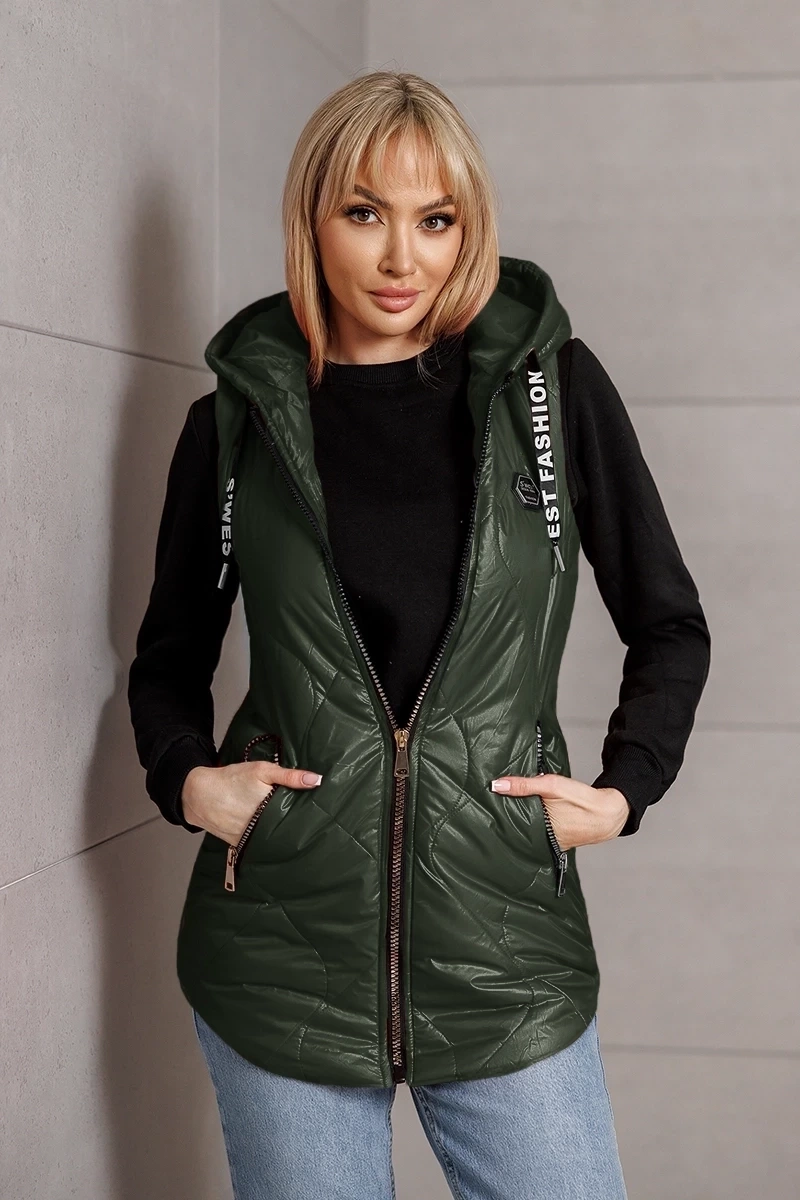 Długa kamizelka z kapturem ciemnozielona