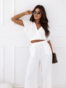 Elegancki komplet krótki top i spodnie z wysokim stanem złamana biel