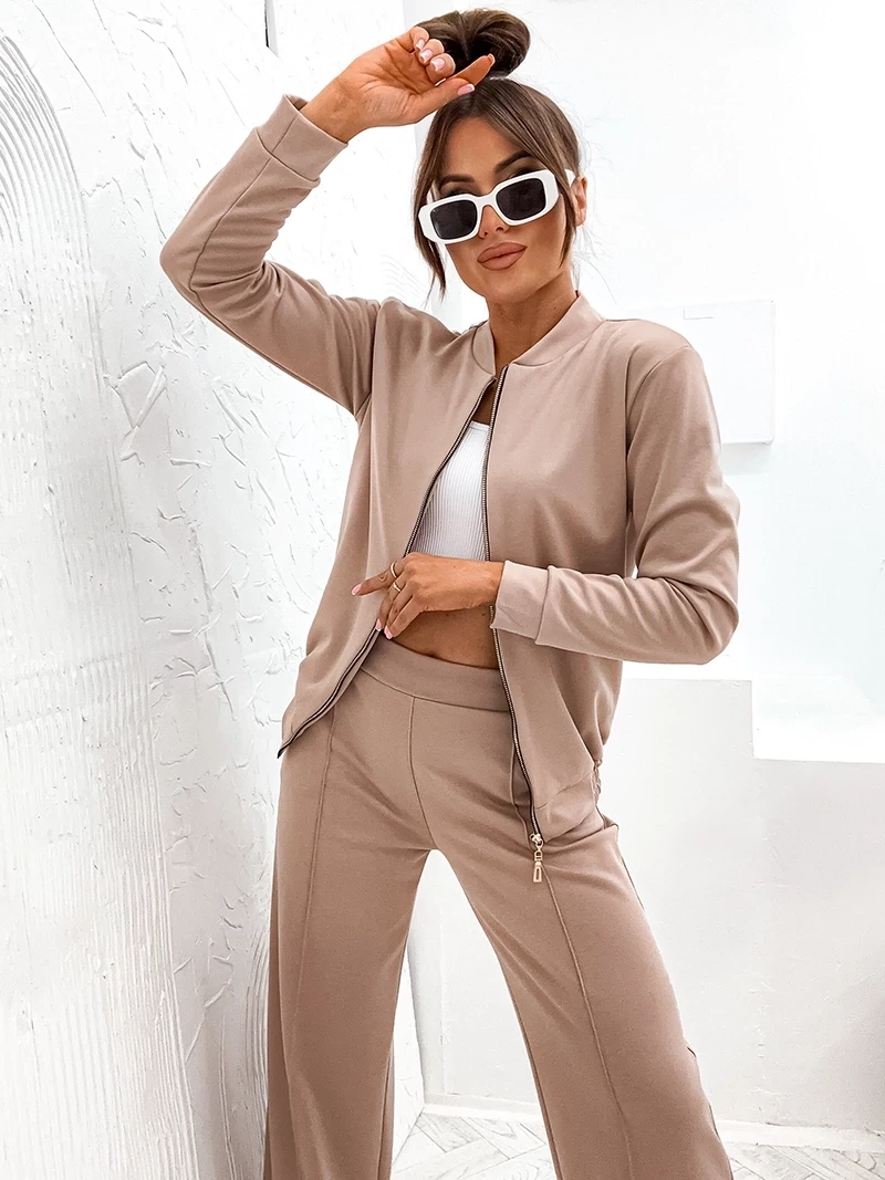 Komfortowy ciemnobeżowy komplet damski bluza + szerokie spodnie