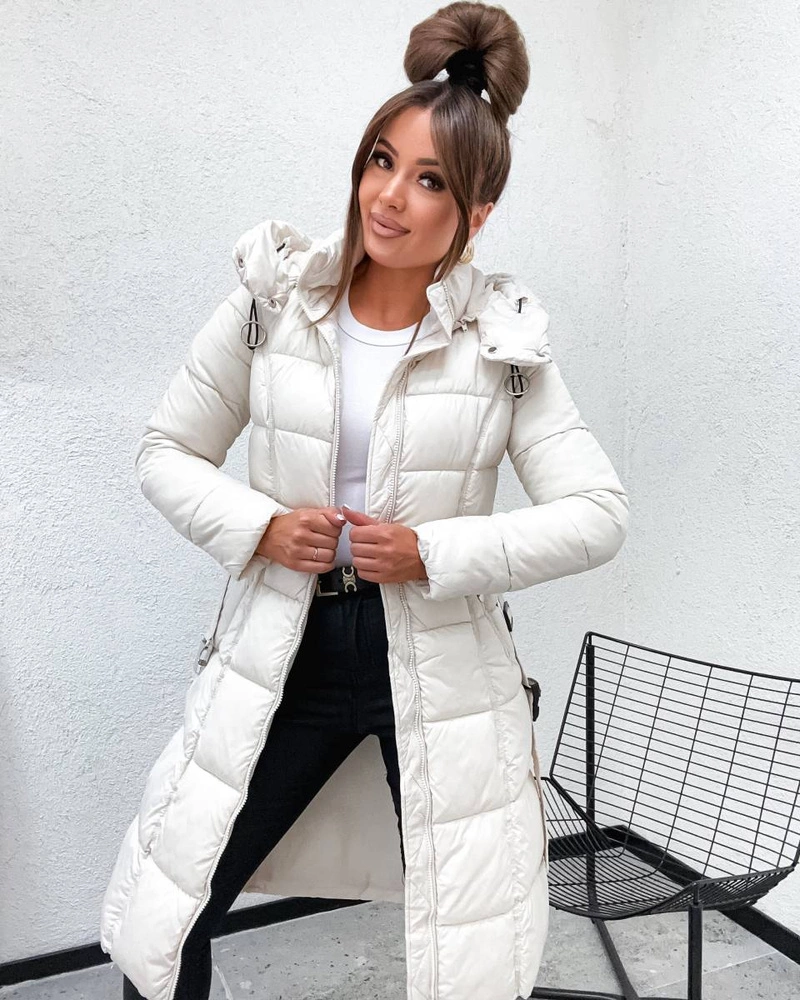 Pikowana ecru kurtka z kapturem i dzianinowymi rękawami