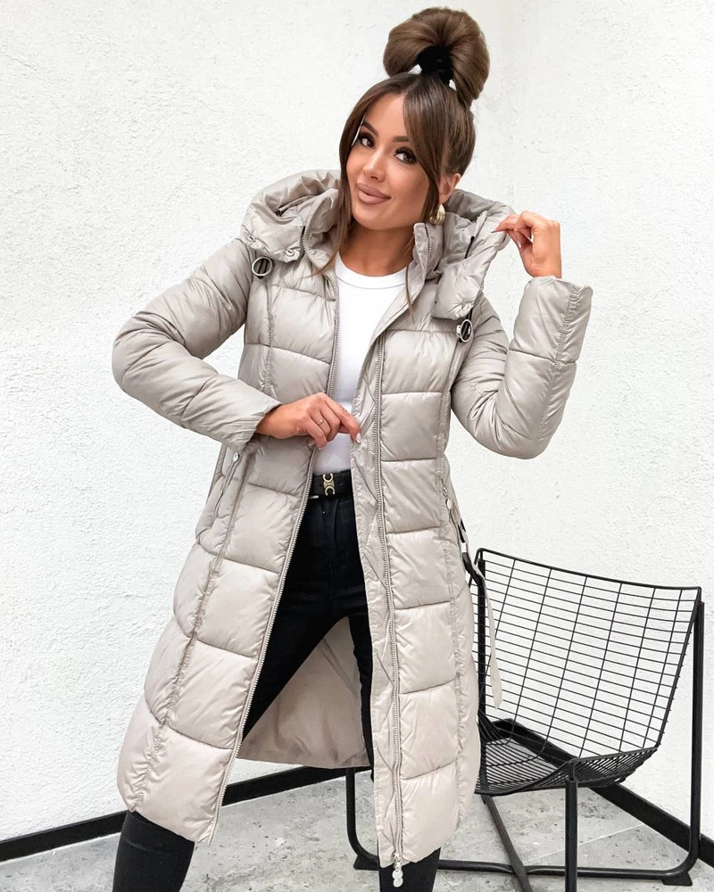 Pikowana ciemnobeżowa kurtka z kapturem i dzianinowymi rękawami