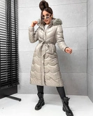 Długi, pikowany damski płaszcz z paskiem beżowy