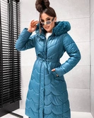 Długi, pikowany damski płaszcz z paskiem morski