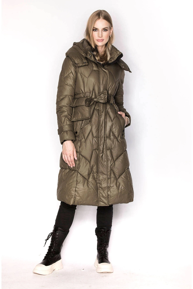 Puchowa kurtka ze stójką i kapturem oliwkowa (ag2-j82)