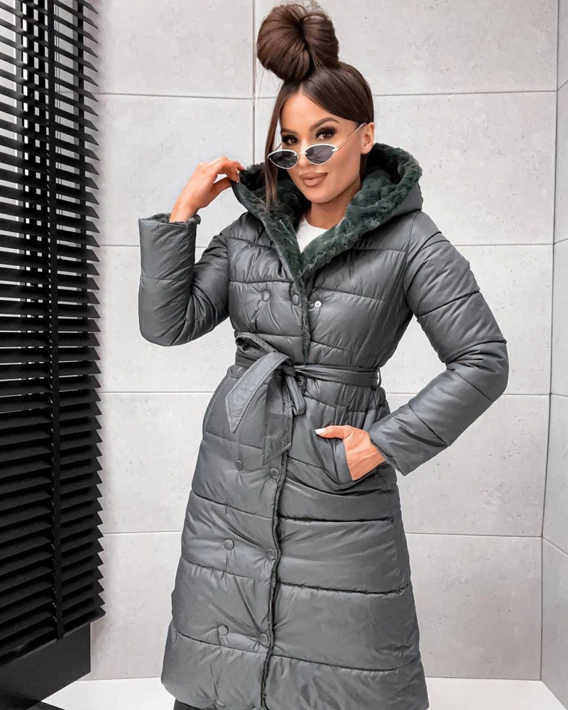 Zimowa damska kurtka khaki poniżej kolan