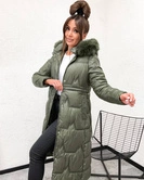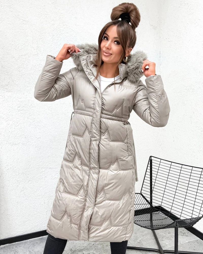 Długi, pikowany damski płaszcz z paskiem beżowy