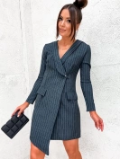 Granatowa elegancka sukienka kopertowa w drobne paski