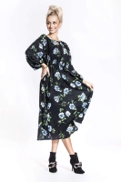 Czarna sukienka w beżowe kwiaty z rękawami typu nietoperz