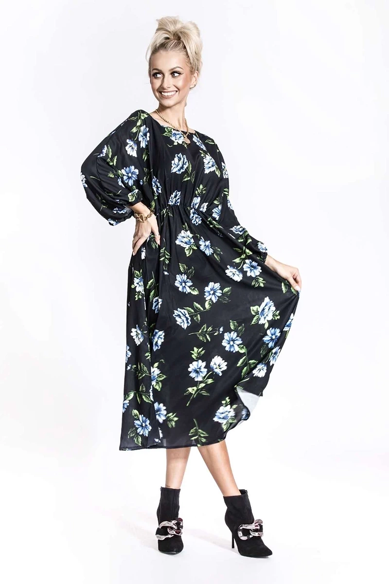 Czarna sukienka w niebieskie kwiaty z rękawami typu nietoperz
