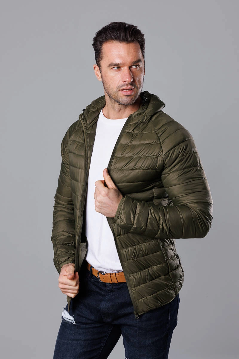 Oliwkowa pikowana kurtka męska z kapturem