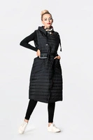 Granatowy pikowany płaszcz z wysoką stójką i kapturem