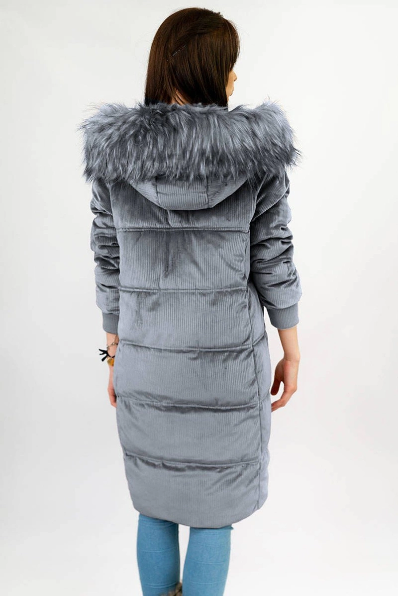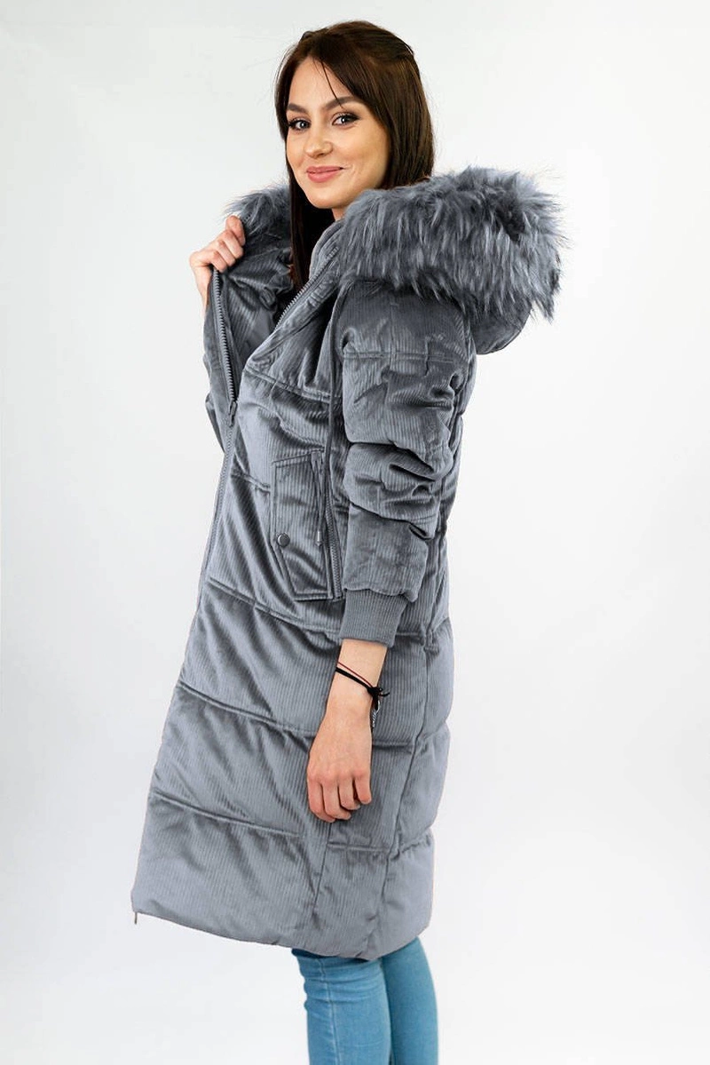 Opinie o Zimowa sztruksowa kurtka damska z kapturem szara (7763)