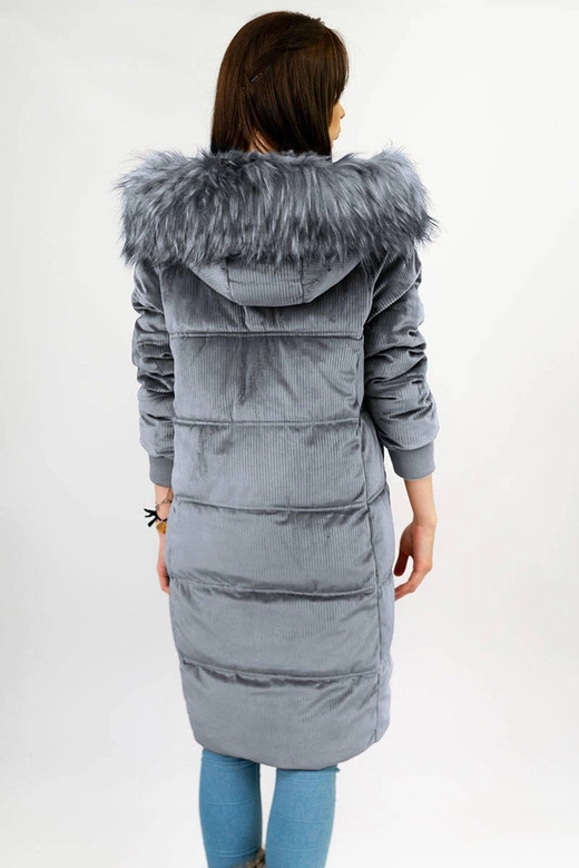 Zimowa sztruksowa kurtka damska z kapturem szara (7763)