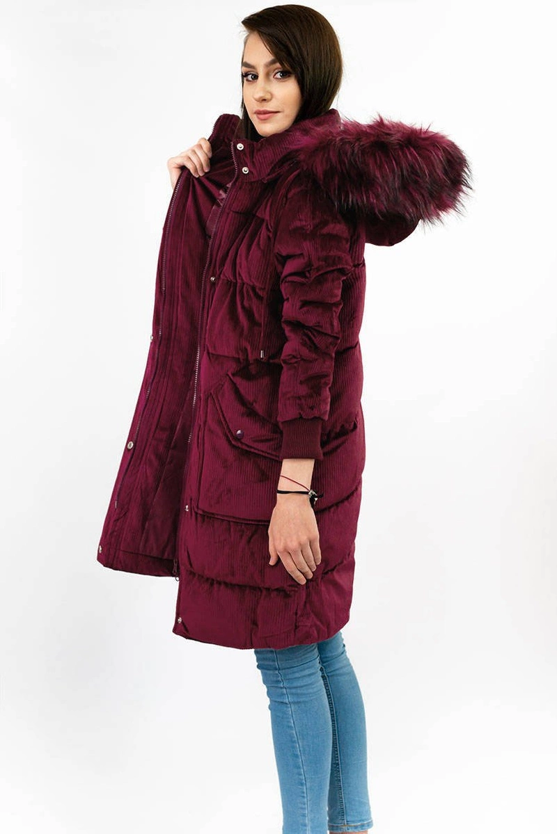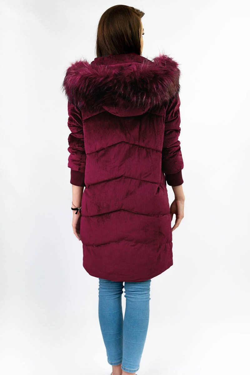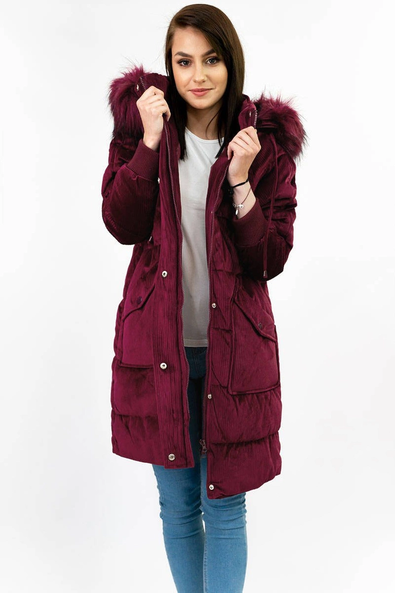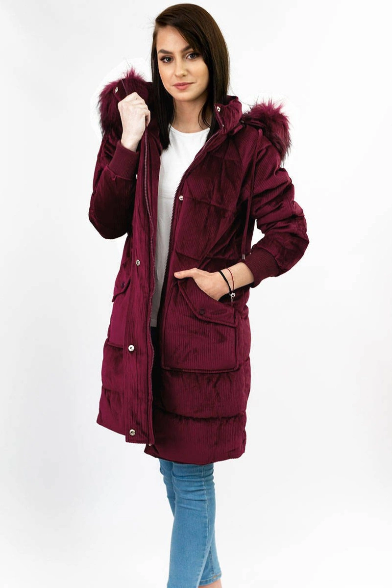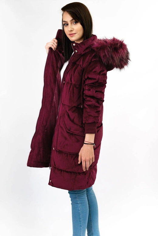 Opinie o Sztruksowa zimowa kurtka damska z kapturem bordowa (7764)