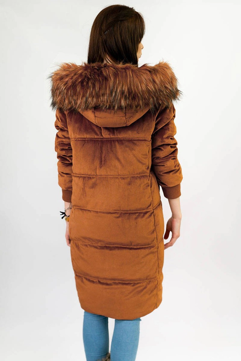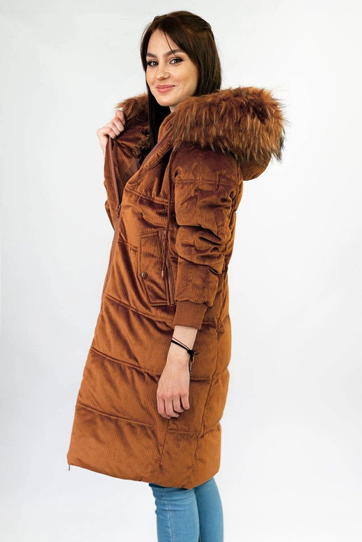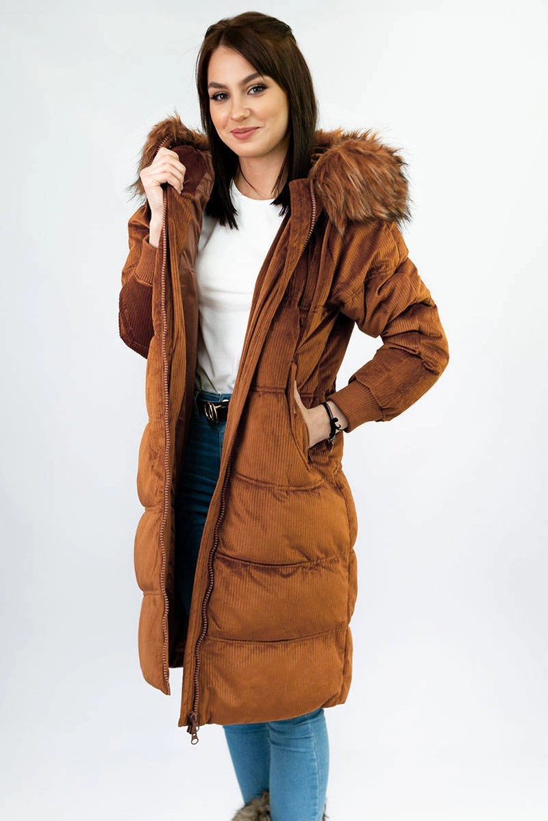 Opinie o Zimowa sztruksowa kurtka damska z kapturem karmelowa (7763)