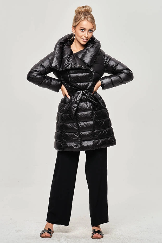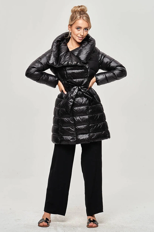 Stylowa kurtka z wywijaną stójką, zapinana na podwójny zamek i panel z napami. Posiada dwie kieszenie, pasek oraz schowane ściągacze na końcach rękawów. Prosty krój i długość do połowy uda zapewniają elegancki wygląd, a ocieplenie syntetycznym puchem gwarantuje komfort w chłodne dni.