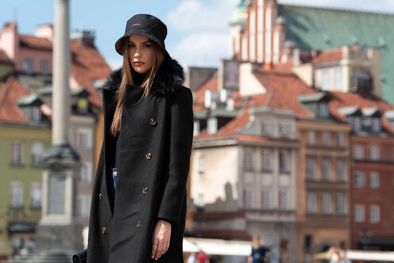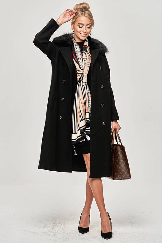 Długi płaszcz z futrzanym kołnierzem czarny (20201202)