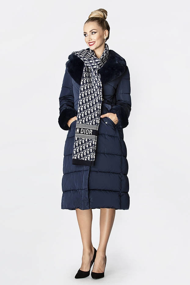 Długa kurtka zimowa z futrzanym kołnierzem granatowa (j9-071)