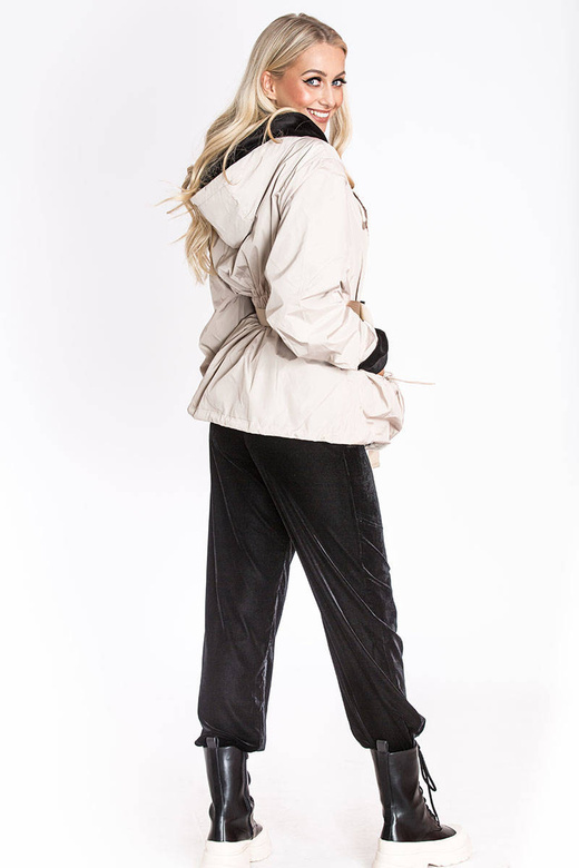 Cienka kurtka z kapturem to idealny wybór na chłodniejsze dni. Kaptur nieodpinany, dodaje jej sportowego charakteru. Kurtka zapinana jest na zamek oraz posiada panel z napami, co ułatwia szybkie zakrycie się przed deszczem. Dwie kieszenie po bokach pomieszczą drobne przedmioty, a podszewka zapewnia dodatkowe ciepło. Elastyczna guma ściągająca z tyłu w talii pozwala na dopasowanie kurtki do sylwetki, a jej długość sięga do bioder, co sprawia, że jest wygodna i praktyczna w codziennym użytkowaniu.