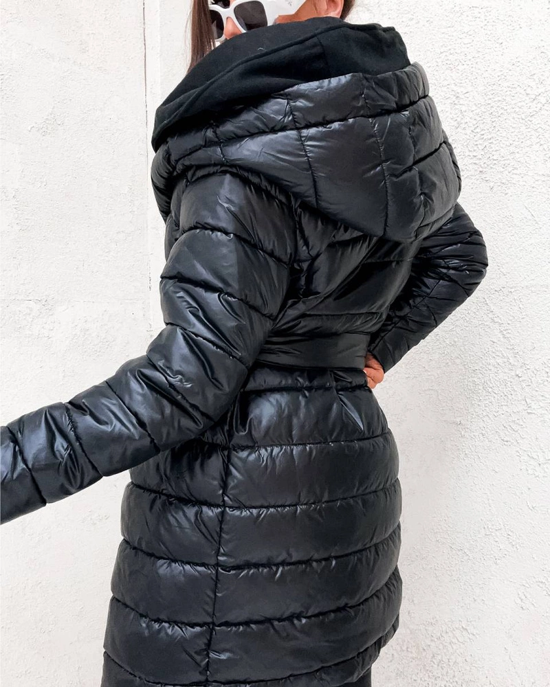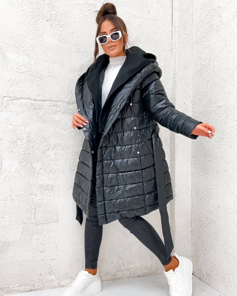 Luźna pikowana kurtka z podwójnym kapturem i wiązanym paskiem. Ocieplona syntetycznym puchem, z odpinanym wewnętrznym kapturem, kieszeniami i długością do połowy uda – wygodna i stylowa na chłodniejsze dni.