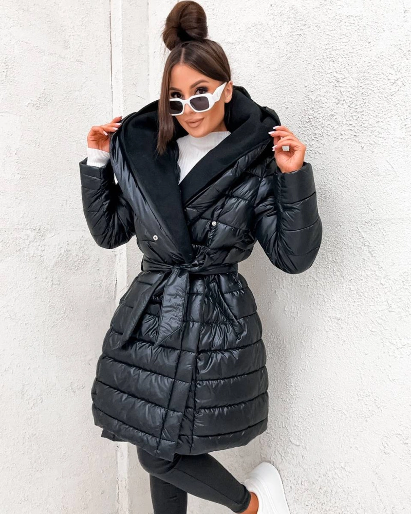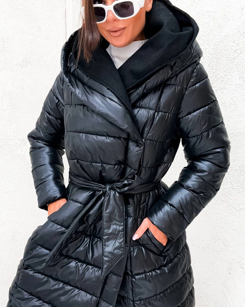 Zimowa pikowana kurtka z paskiem czarna