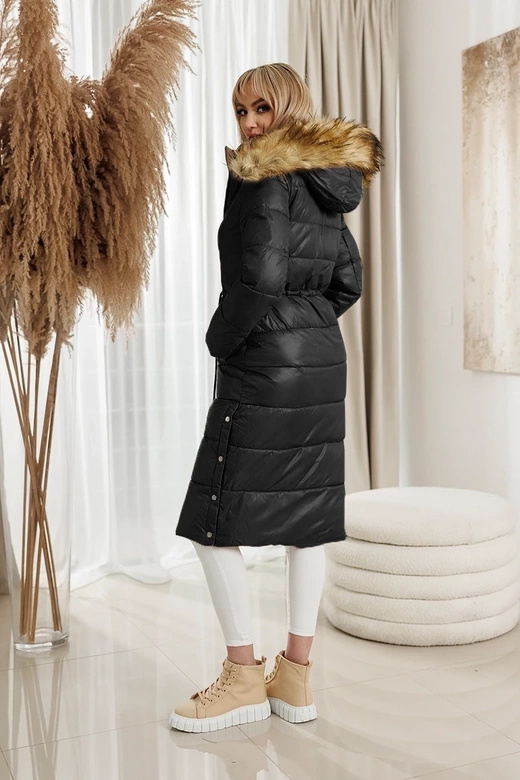 Kurtka z kapturem to stylowy i funkcjonalny wybór na chłodniejsze dni. Wyposażona w odpinany kaptur i futerko, pozwala na dostosowanie do warunków pogodowych i osobistych preferencji. Zapinana na dwustronny zamek, zapewnia wygodę użytkowania. Trok ściągający w talii umożliwia idealne dopasowanie do sylwetki, a prosty fason gwarantuje klasyczny wygląd. Płaszcz posiada dwie kieszenie, które pomieszczą niezbędne drobiazgi. Lekko ocieplana puchem syntetycznym, zapewnia komfort cieplny. Dodatkowo, na dole po bokach znajdują się rozcięcia na napy, które ułatwiają ruch. Długość kurtki sięga poniżej kolan, zapewniając dodatkową ochronę przed zimnem.
