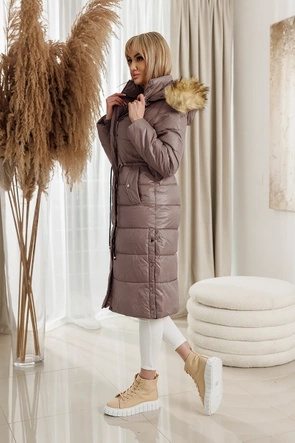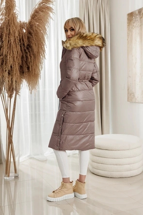 Kurtka z kapturem to stylowy i funkcjonalny wybór na chłodniejsze dni. Wyposażona w odpinany kaptur i futerko, pozwala na dostosowanie do warunków pogodowych i osobistych preferencji. Zapinana na dwustronny zamek, zapewnia wygodę użytkowania. Trok ściągający w talii umożliwia idealne dopasowanie do sylwetki, a prosty fason gwarantuje klasyczny wygląd. Płaszcz posiada dwie kieszenie, które pomieszczą niezbędne drobiazgi. Lekko ocieplana puchem syntetycznym, zapewnia komfort cieplny. Dodatkowo, na dole po bokach znajdują się rozcięcia na napy, które ułatwiają ruch. Długość kurtki sięga poniżej kolan, zapewniając dodatkową ochronę przed zimnem.