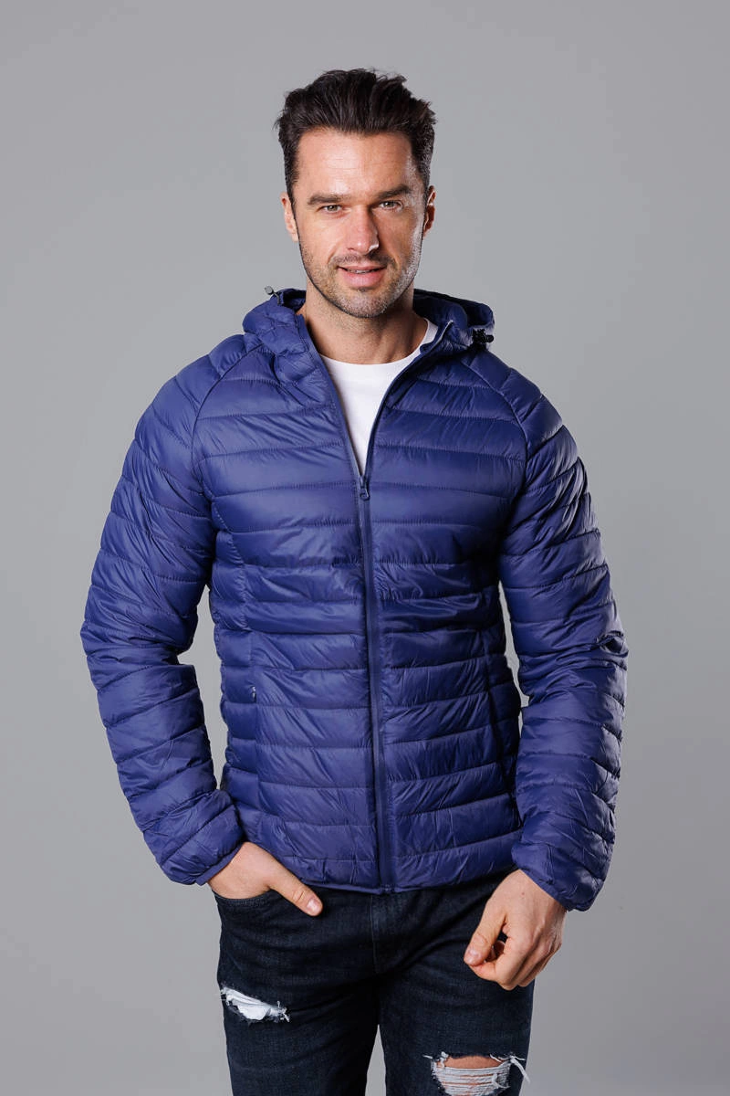 Opinie o Pikowana kurtka męska z kapturem jasny granat