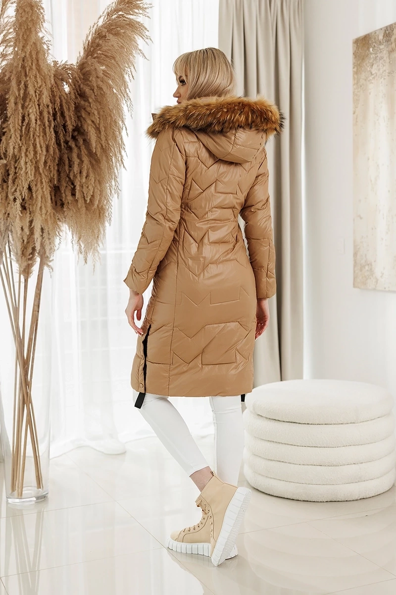 Kurtka z kapturem to idealny wybór na chłodne dni, łączący styl i funkcjonalność. Posiada odpinany kaptur z odpinanym futerkiem, co pozwala na dostosowanie do warunków pogodowych. Dwustronny zamek zapewnia wygodę użytkowania, a schowane ściągacze na końcach rękawów chronią przed zimnem. Taliowany krój podkreśla sylwetkę, dodając elegancji. Kurtka posiada dwie praktyczne kieszenie oraz rozcięcia po bokach, zapinane na napy, które zwiększają swobodę ruchów. Ocieplana puchem syntetycznym, gwarantuje ciepło i komfort. Jej długość sięga do kolan, zapewniając dodatkową ochronę przed chłodem.