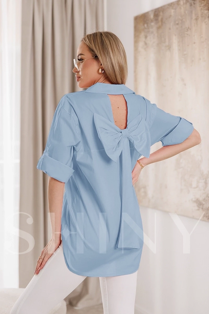 Ta koszula to doskonały wybór dla kobiet poszukujących unikalnego i stylowego elementu do swojej garderoby. Bluzka ta zachwyca nie tylko swoim wyglądem, ale także funkcjonalnością. Kołnierzyk i guziki dodają koszuli elegancji i klasyki, podczas gdy podwijane rękawy 3/4 nadają jej lekkości i swobodnego charakteru. Luźny fason sprawia, że koszula jest nie tylko wygodna, ale także modna i uniwersalna. Największym atutem tej bluzki są jednak jej ozdobne plecy z kokardą, które nadają całości wyjątkowego uroku i sprawiają, że koszula zyskuje niepowtarzalny charakter. Asymetryczny dół dodaje bluzce nowoczesności i sprawia, że wygląda jeszcze bardziej interesująco.