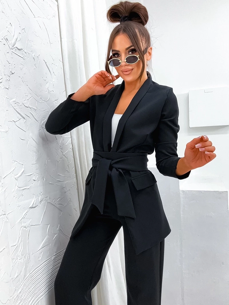 Komplet składa się z luźnej marynarki bez zapięcia, ozdobionej klapami i z długimi rękawami. Dodatkowo, marynarka ma wiązany pasek, a jej długość sięga do połowy uda. Szerokie spodnie posiadają elastyczną gumkę w pasie oraz proste nogawki. Spodnie mają dwie kieszenie. Jest to idealny zestaw dla tych, którzy poszukują wygodnego, a zarazem stylowego ubioru.