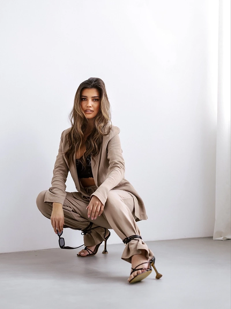Damski garnitur z lnem to idealny wybór na letnie dni, łączący elegancję z luzem. Luźna marynarka na jeden guzik dodaje szyku i swobody. Klapy nadają charakteru a długość sięgająca poniżej bioder dodaje subtelnego wyrafinowania.