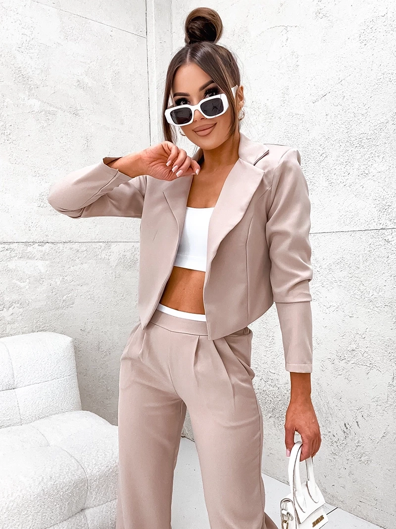 Opinie o Elegancki beżowy komplet marynarka ze spodniami
