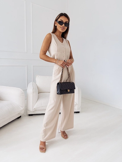 Kamizelka na guziki dodaje elegancji i klasy zestawowi. Długość do pasa sprawia, że doskonale komponuje się z szerokimi spodniami, podkreślając jednocześnie sylwetkę.