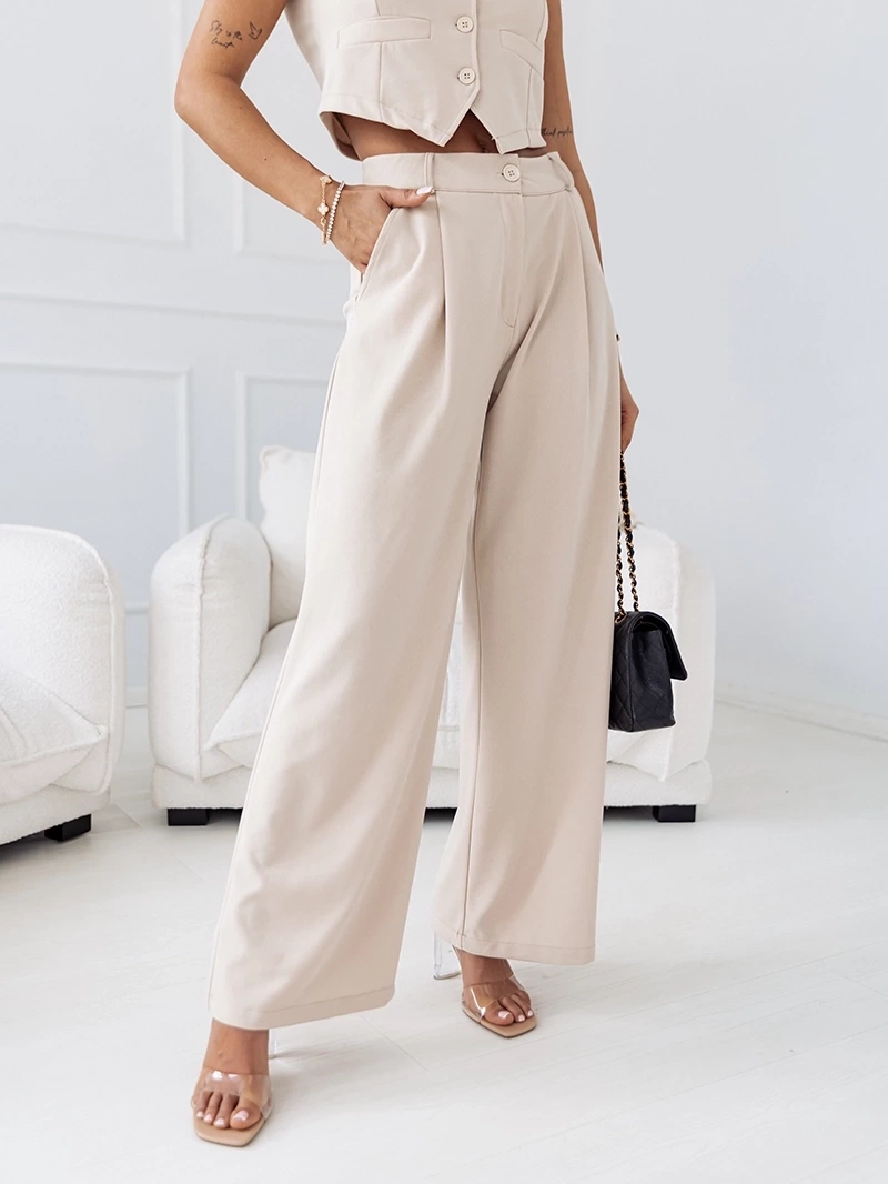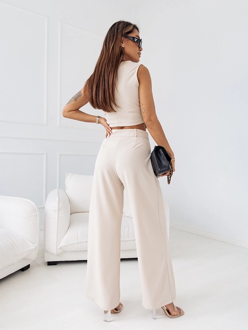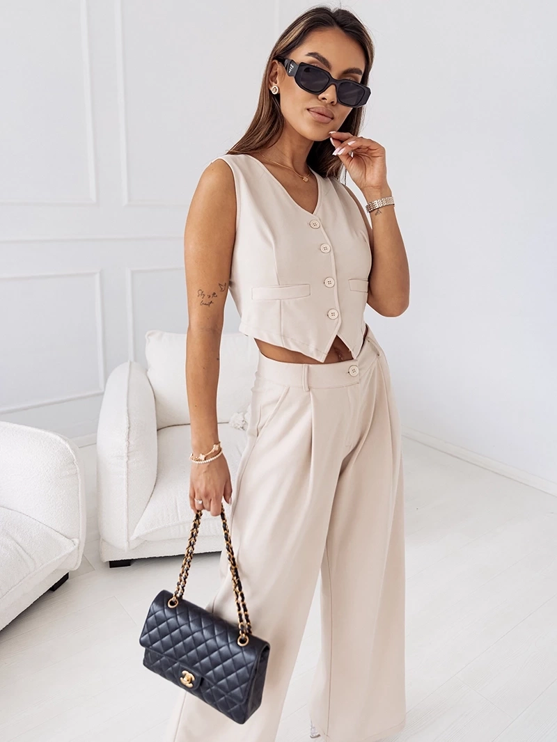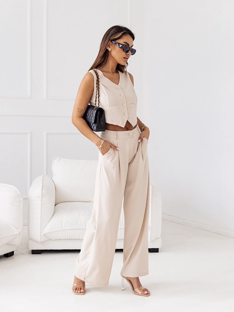 Elegancki zestaw z krótką kamizelką i szerokimi spodniami to idealna propozycja dla osób poszukujących wyrafinowanej stylizacji z nutą nowoczesności.