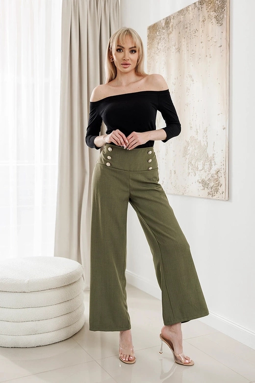 Eleganckie khaki spodnie damskie ze złotymi guzikami