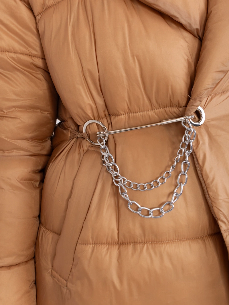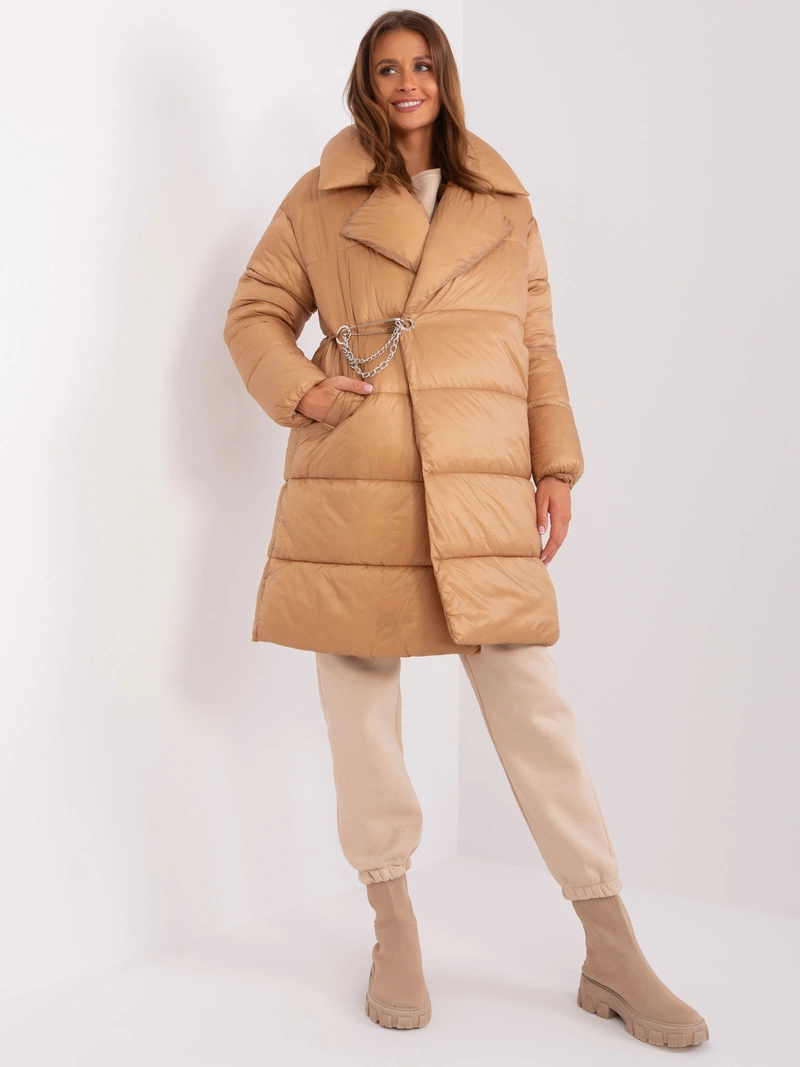 Puchowa kurtka zimowa z ozdobnym zapięciem camel