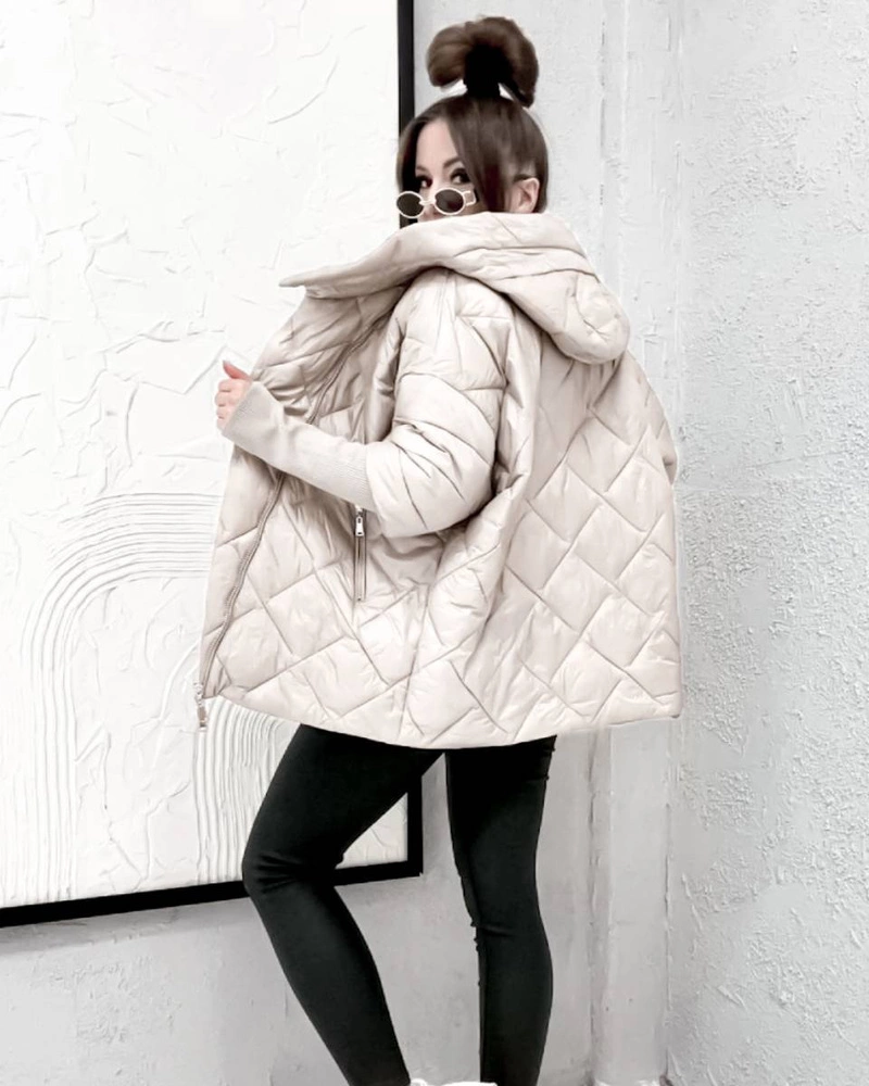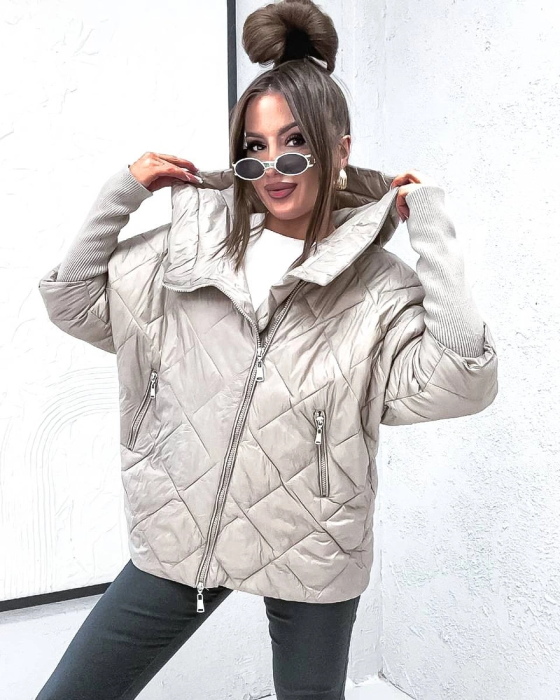 Opinie o Pikowana ecru kurtka z kapturem i dzianinowymi rękawami