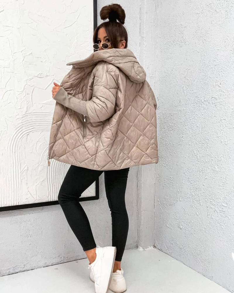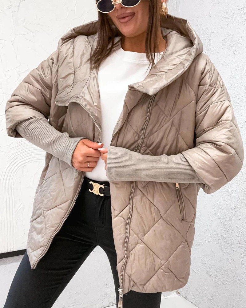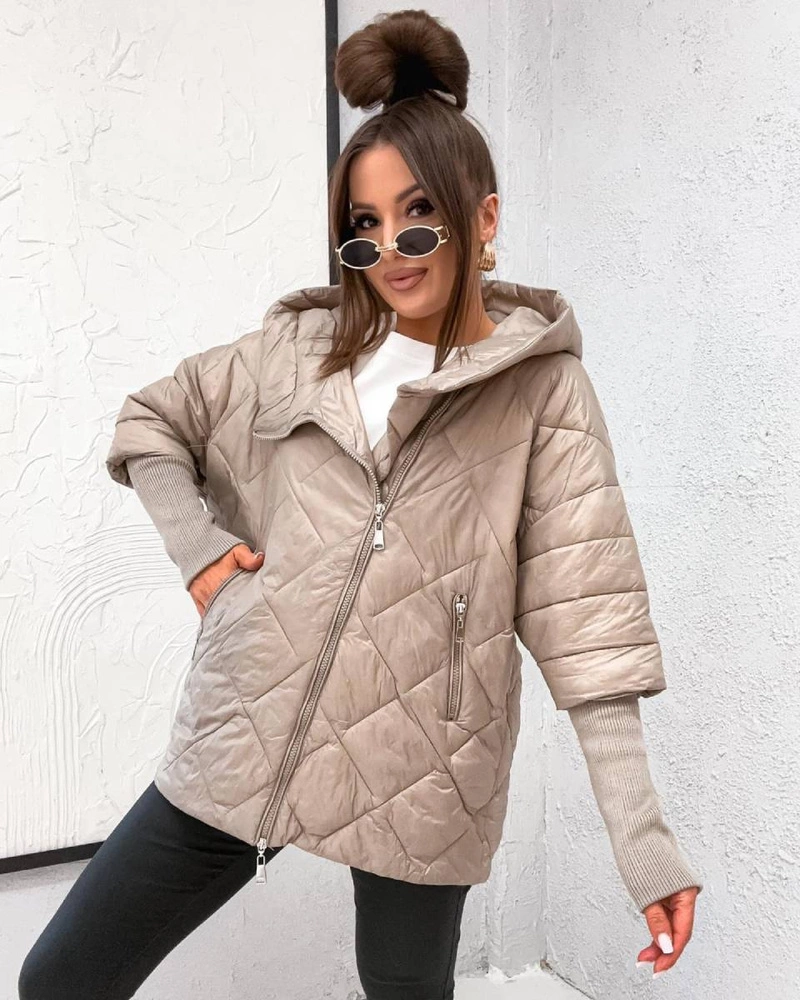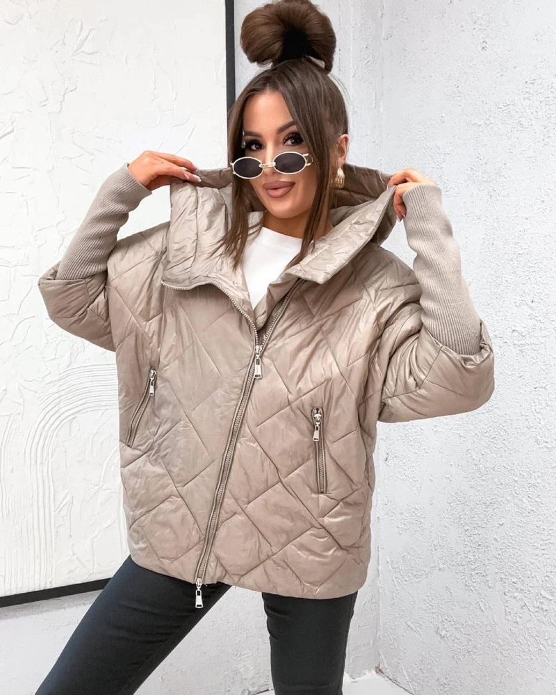Opinie o Pikowana ciemnobeżowa kurtka z kapturem i dzianinowymi rękawami