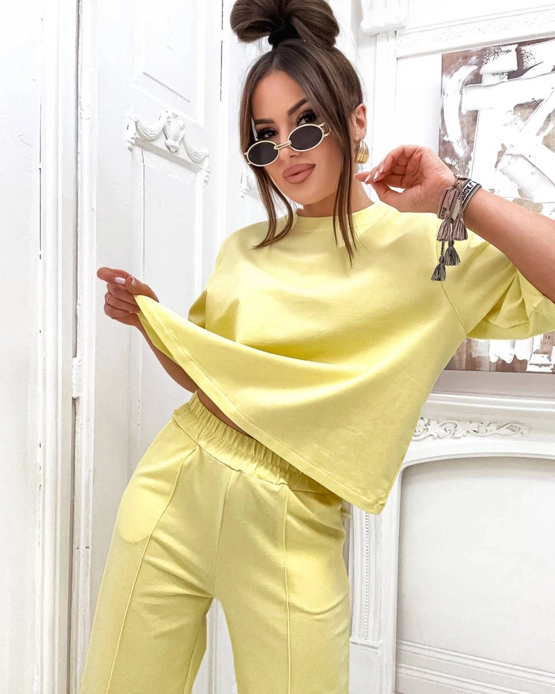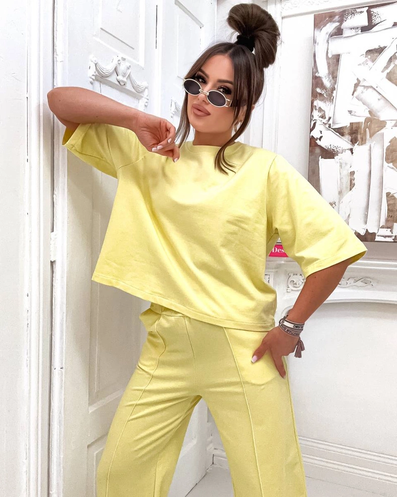 Bawełniany komplet oversize to idealne połączenie stylu i wygody. Luźny t-shirt z krótkim rękawem i długością do bioder zapewnia swobodę ruchów, a szerokie spodnie z gumką w pasie i kieszeniami gwarantują komfort na co dzień. Komplet jest mniejszy niż sugeruje metka.