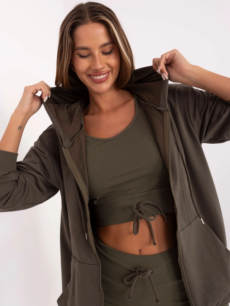 Khaki sportowy komplet bluza + top + szorty