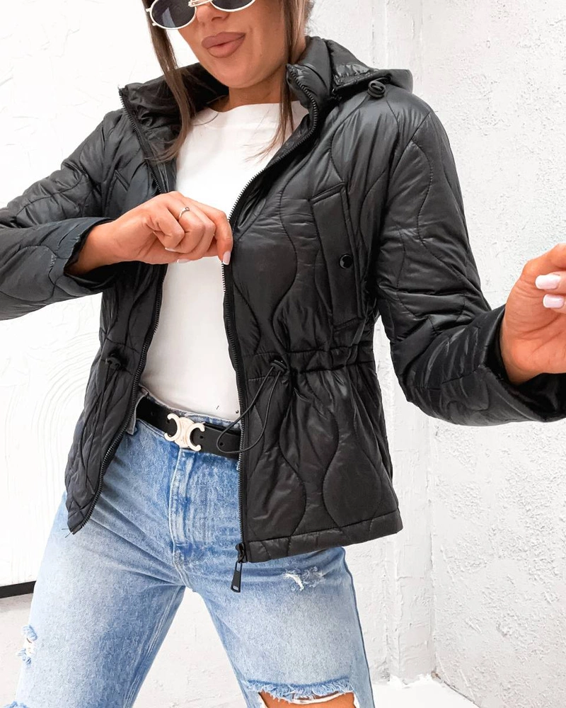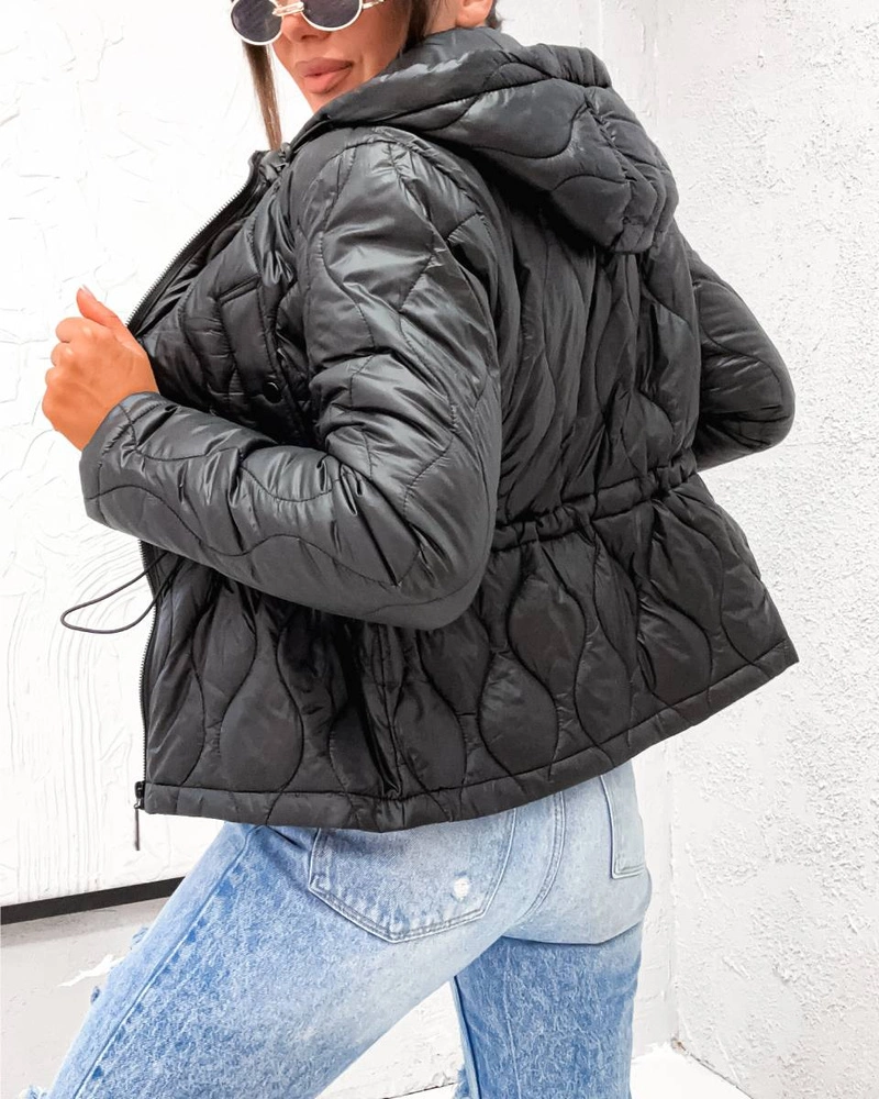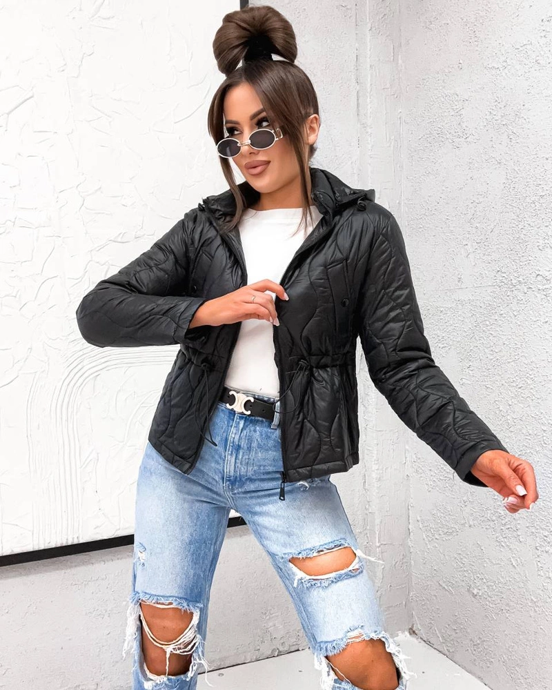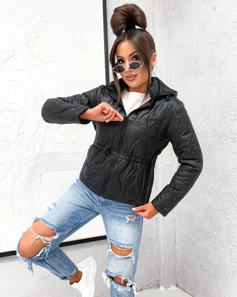 Lekka damska kurtka z odpinanym kapturem, lekko ocieplona warstwą puchu syntetycznego. Zapinana na zamek, z gumką ściągającą pod biustem, która podkreśla sylwetkę. Posiada dwie kieszenie zapinane na napy. Prosty krój i długość do bioder zapewniają komfort i uniwersalny styl na co dzień.