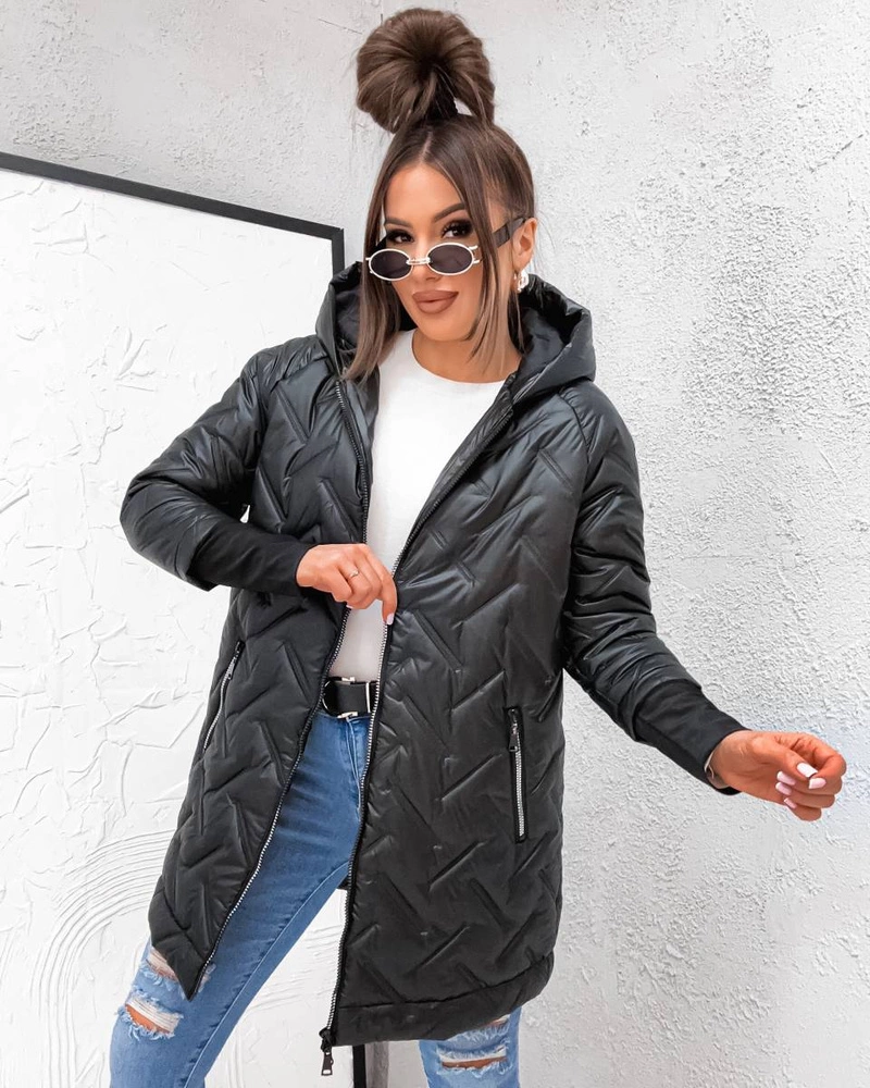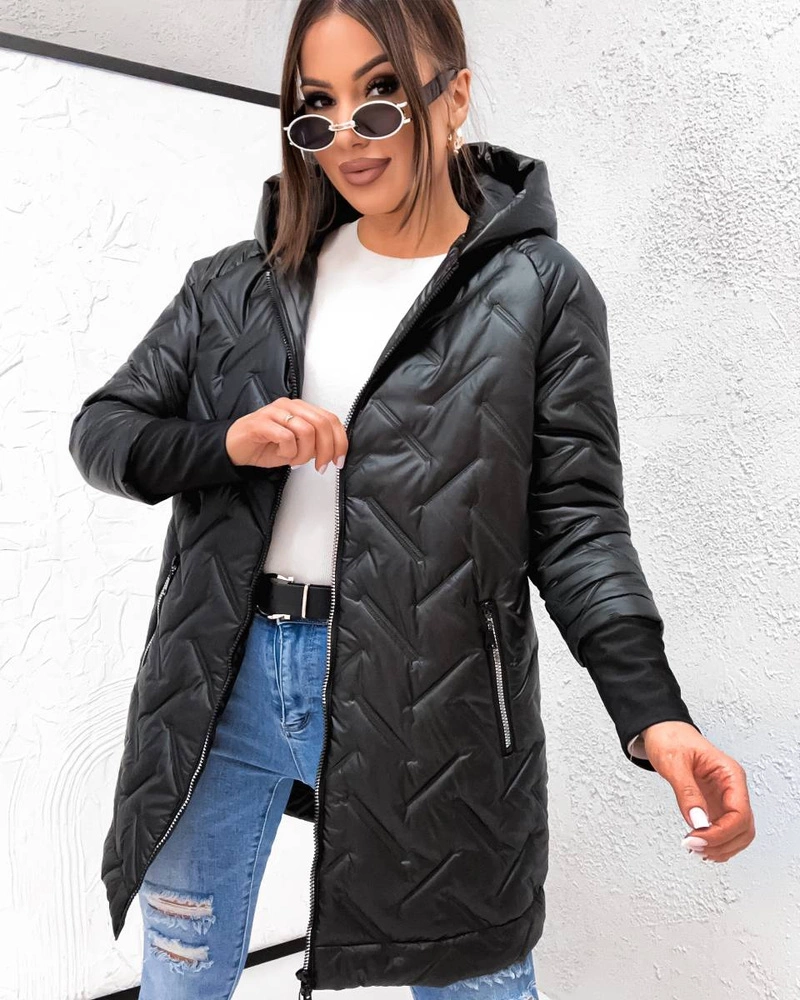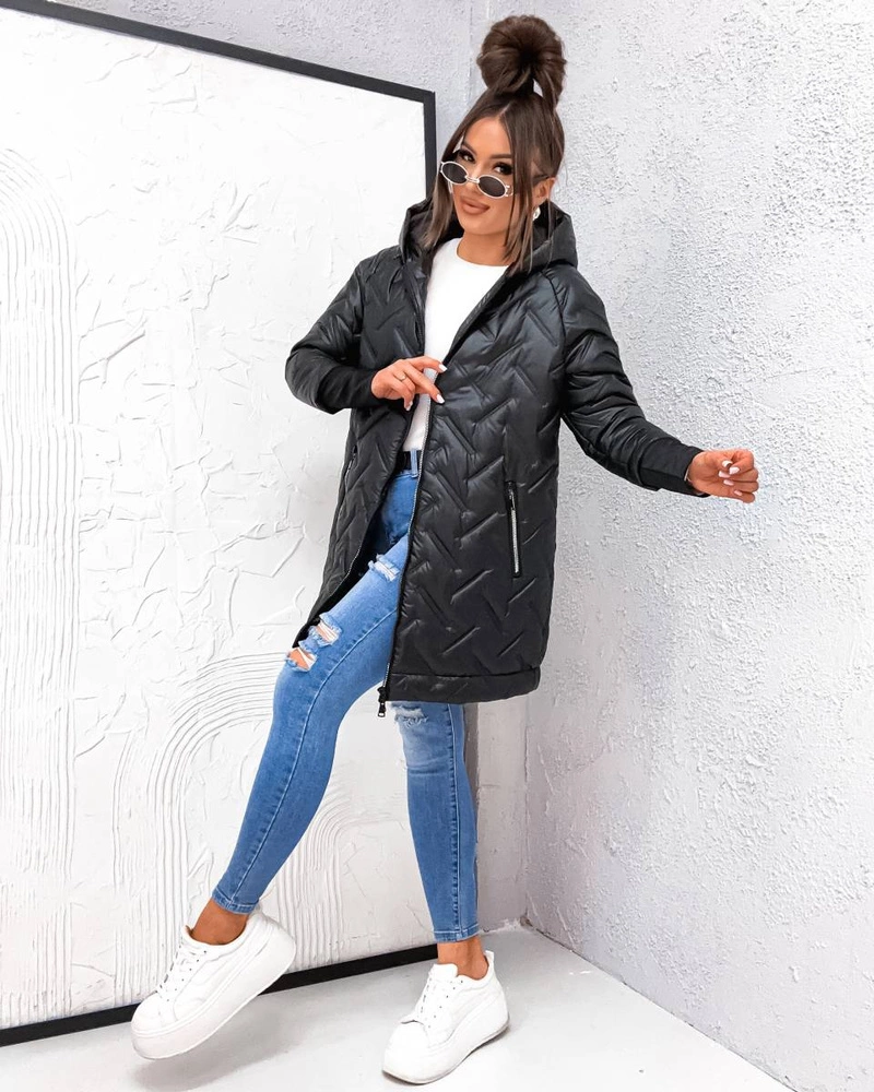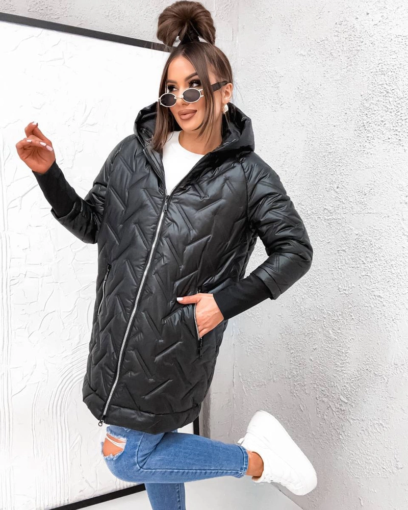 Pikowana kurtka plus size z kapturem w fasonie trapezowym. Lekko ocieplona, z dzianinowymi ściągaczami przy rękawach, dwukierunkowym zamkiem i praktycznymi kieszeniami. Długość do połowy uda – komfort i styl na co dzień.