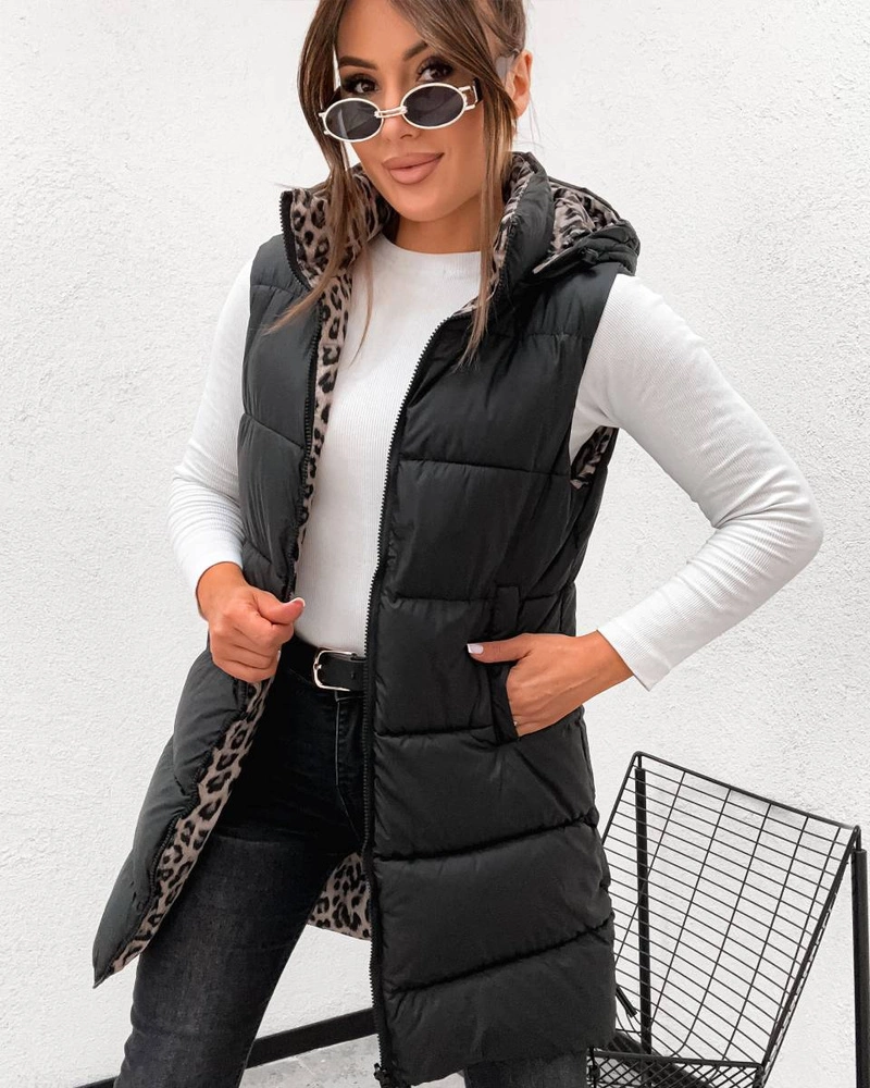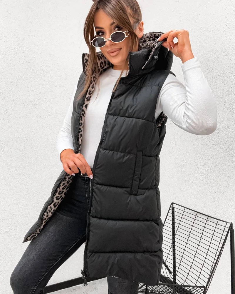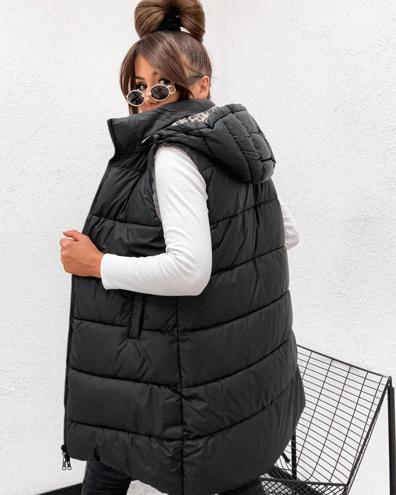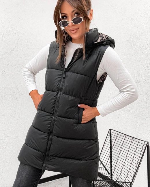 Praktyczna kamizelka dwustronna, ocieplona puchem syntetycznym, z odpinanym kapturem i dwukierunkowym zamkiem. Posiada dwie kieszenie na napy, gumki ściągające po bokach oraz lekko rozszerzany ku dołowi fason. Długość do połowy uda zapewnia wygodę i dodatkową ochronę przed chłodem.