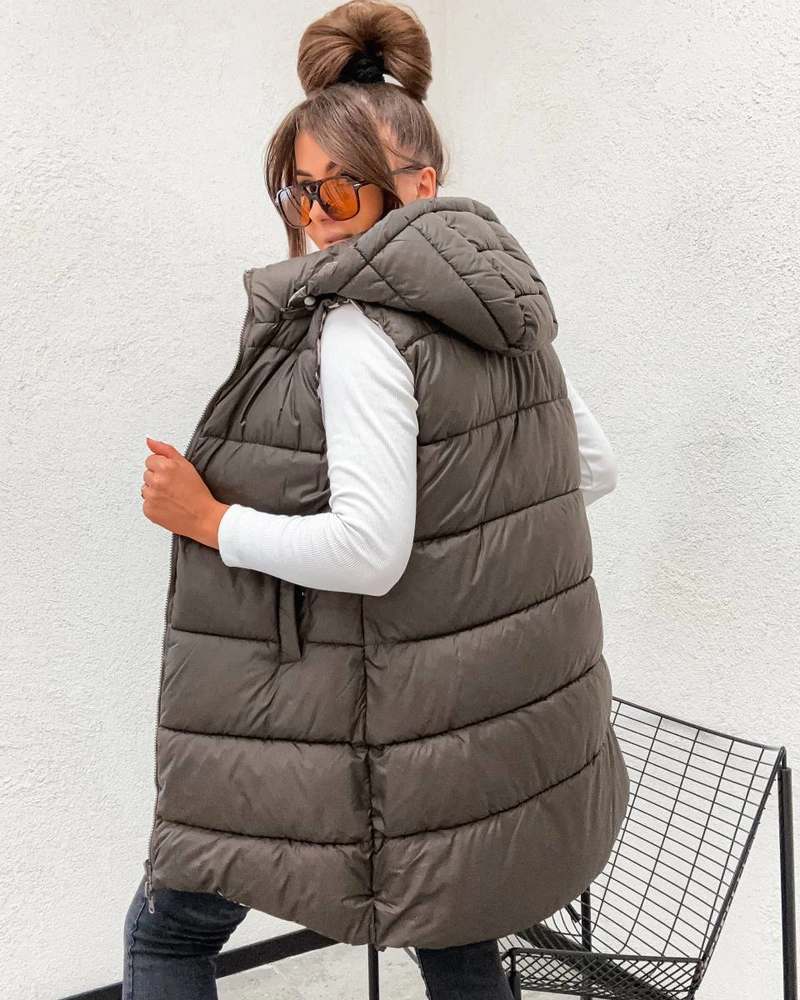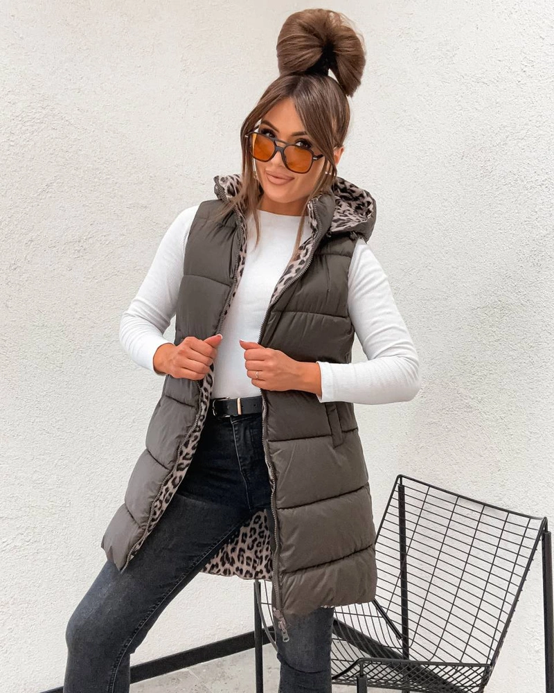 Praktyczna kamizelka dwustronna, ocieplona puchem syntetycznym, z odpinanym kapturem i dwukierunkowym zamkiem. Posiada dwie kieszenie na napy, gumki ściągające po bokach oraz lekko rozszerzany ku dołowi fason. Długość do połowy uda zapewnia wygodę i dodatkową ochronę przed chłodem.