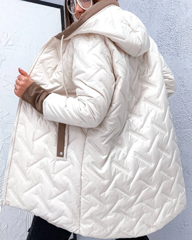 Stylowa kurtka plus size, lekko ocieplona puchem syntetycznym, z nieodpinanym kapturem i rękawami zakończonymi nylonowym ściągaczem. Zapinana na dwukierunkowy zamek, z dwiema niezapinanymi kieszeniami. Długość do połowy uda zapewnia wygodę i ochronę w chłodniejsze dni.