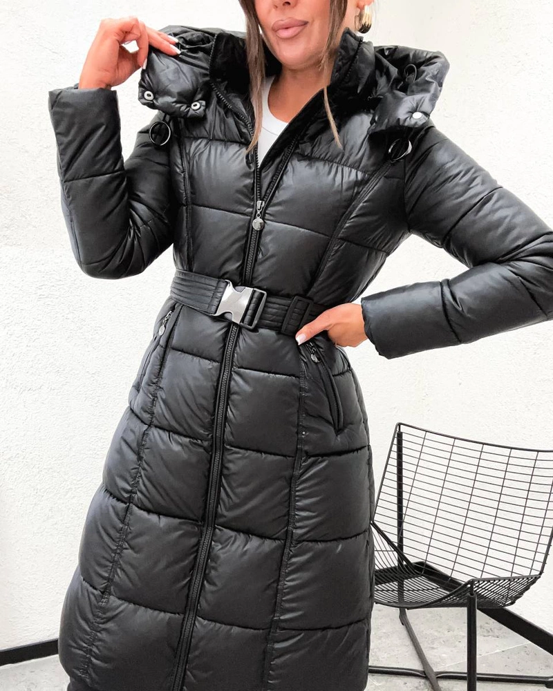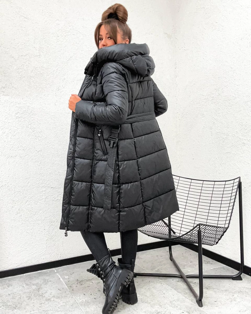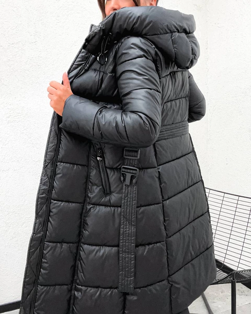 Stylowa, pikowana kurtka zimowa o taliowanym kroju, ocieplona puchem syntetycznym dla maksymalnego komfortu. Posiada odpinany kaptur, dwukierunkowy zamek oraz pasek z klamrą, który podkreśla sylwetkę. Dwie kieszenie i długość do kolan zapewniają funkcjonalność oraz doskonałą ochronę przed zimnem.